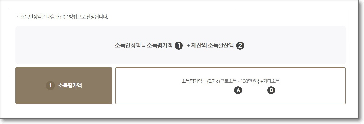다만 소득인정액을 계산하기 위해서는 아래와 같이 근로소득 외에서도 재산소득, 사업소득, 무료임차소득, 공적이전소득을 합하여 계산해야 합니다. 하지만 복지로 모의계산을 이용하시면 간단하게 해결할 수 있으니 너무 걱정 않으셔도 됩니다.