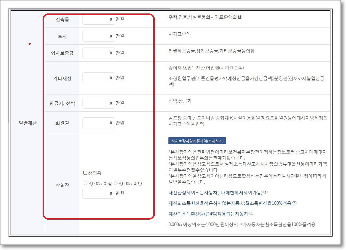 다음은 재산을 입력하시면 됩니다. 여기서 주의해서 보셔야 하는 것이 바로 자동차입니다. 자동차는 3000cc이상이나 4000천만원의 고가 차량의 경우 월소득환산율의 100%를 적용받기에 수급자격에서 탈락할 수 있습니다.