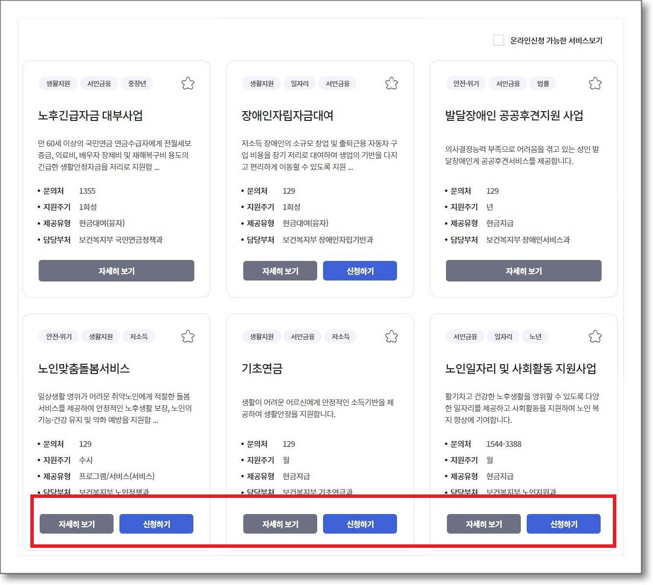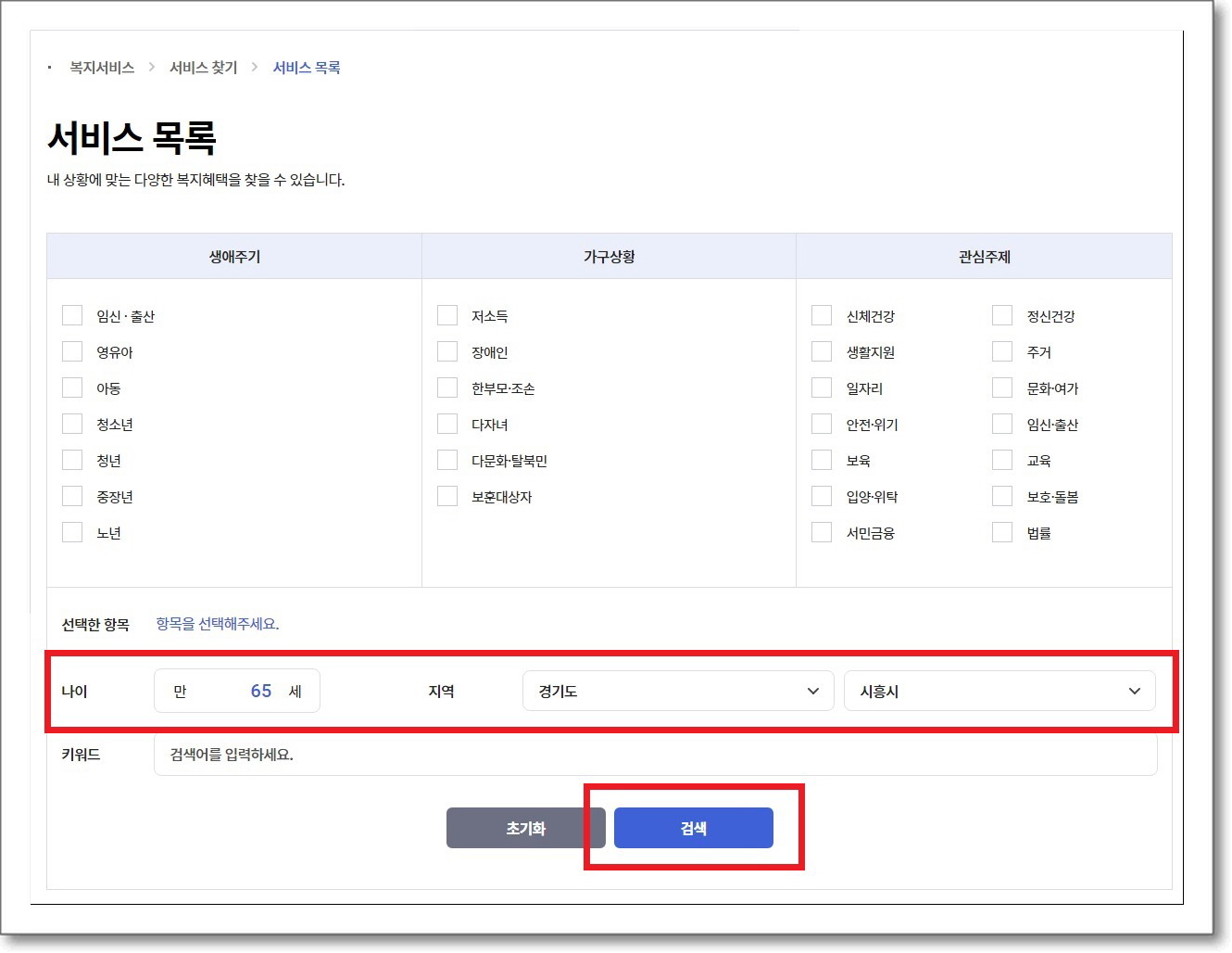 서비스 목록에서 나이와 사는 지역을 선택하시면 만65세이상 노인 헤택을 정부와 지자체 혜택을 한 눈에 확인이 가능합니다.