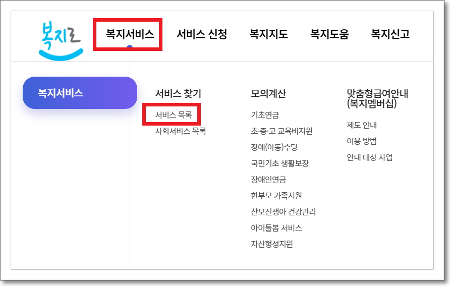 들어오셨다면 홈페이지 맨 위에 복지서비스 > 서비스 목록을 눌러주세요.